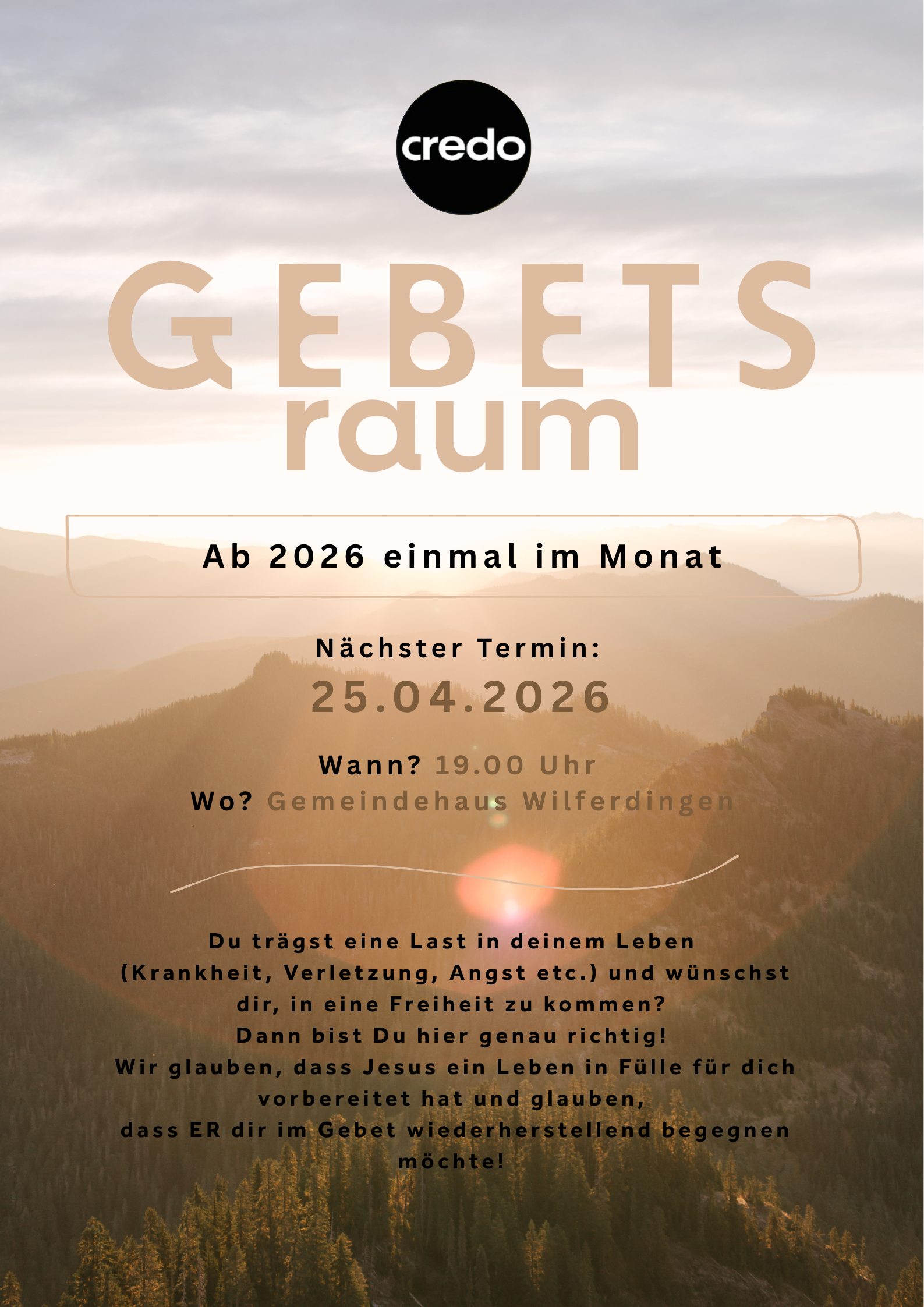Wir laden dich herzlich zu unserem Gebetsraum- Abend ein! Einem Abend voller Glauben und Hoffnung, an dem ein Gebetsteam ganz persönlich und geschützt für dein Anliegen betet. Wir glauben fest daran, dass unser Gott ein Gott der Heilung, der Befreiung und der Wiederherstellung ist. Er hat uns verheißen, dass wir in Jesus Christus Heilung und Freiheit finden können. Komm mit einem offenen Herzen und erwarte von Gott das Beste für dein Leben - egal, welche Herausforderung du gerade durchmachst.